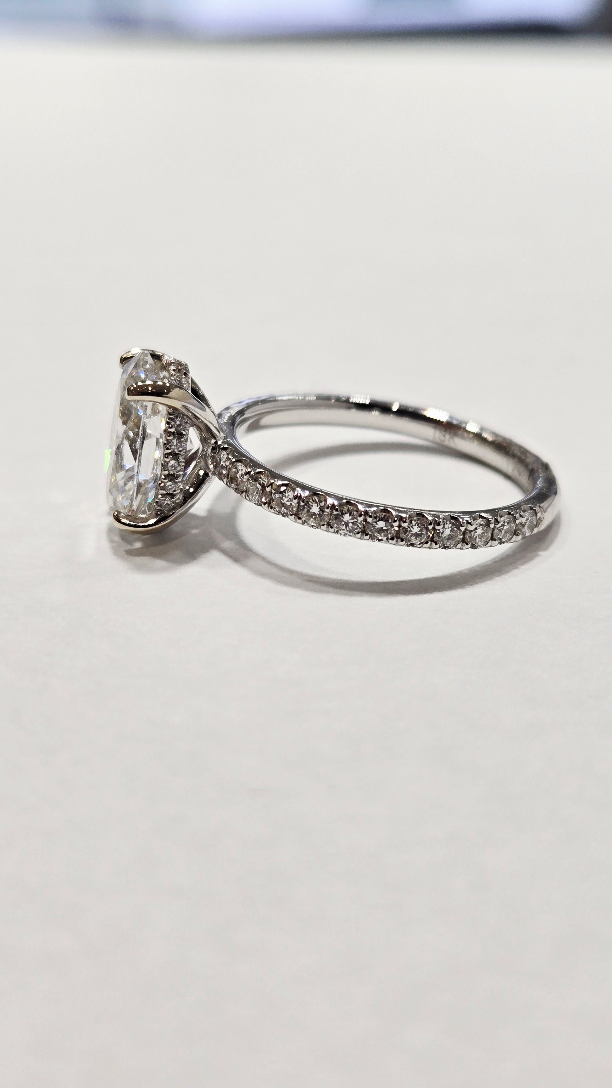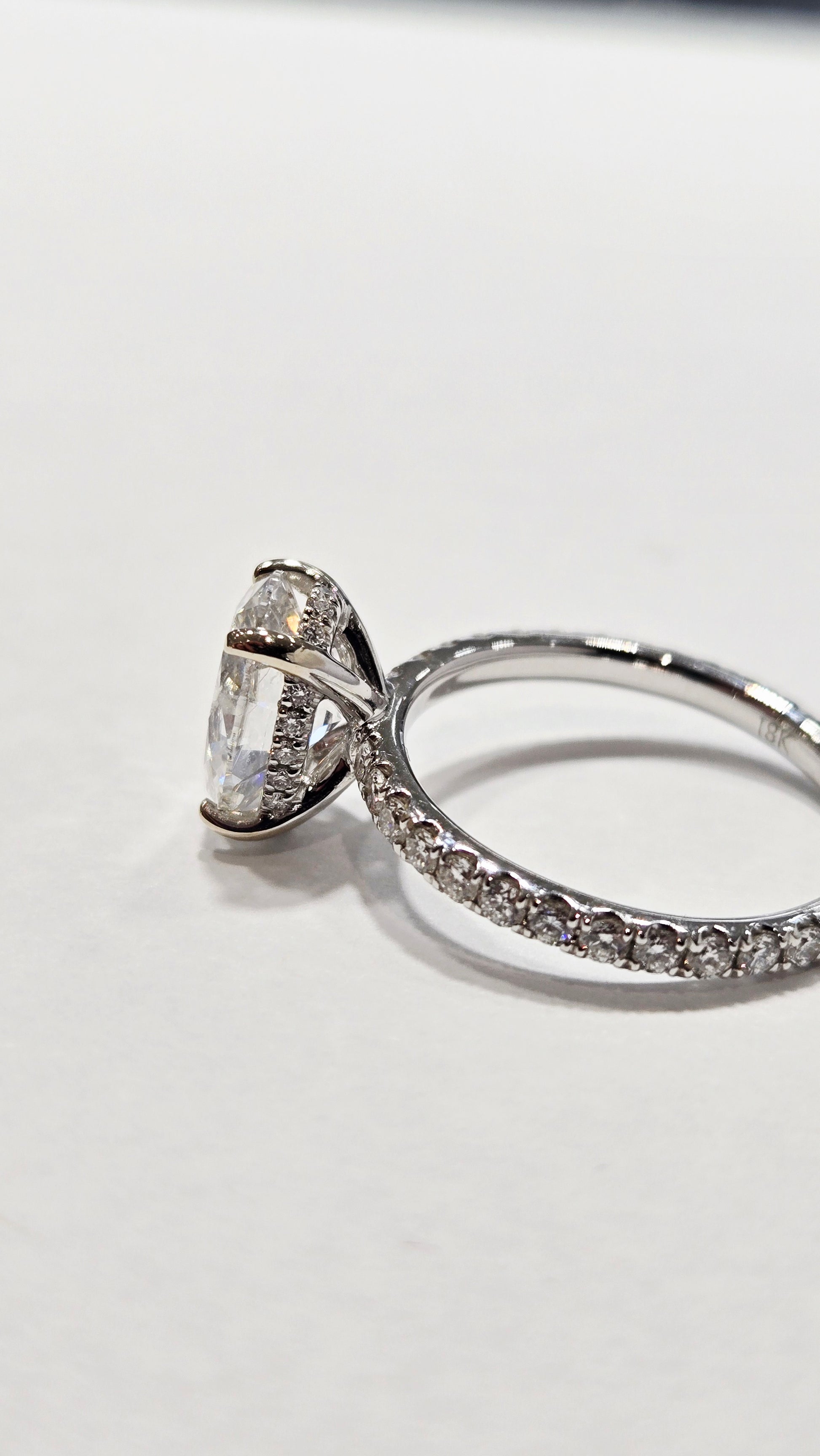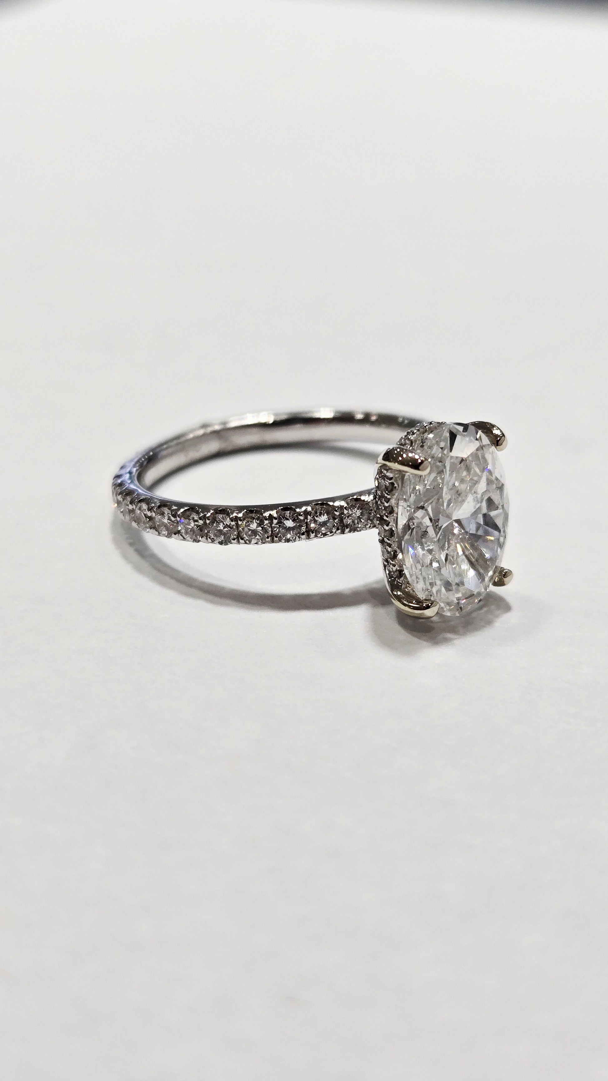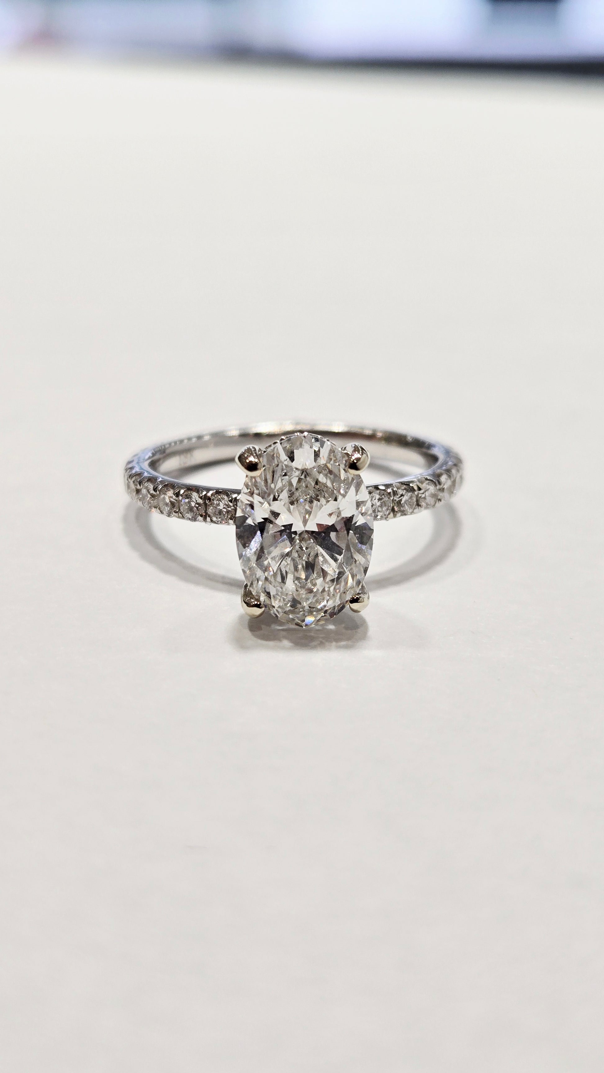 A stunning 2-carat oval diamond sits elegantly in a graceful 18k white gold setting.