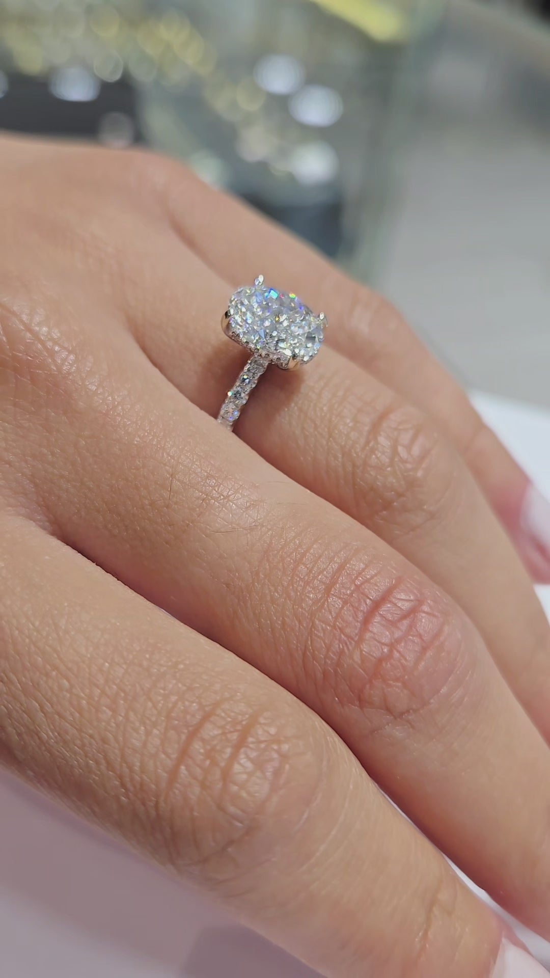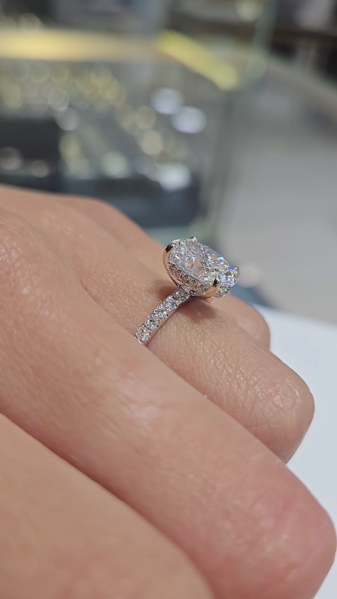 The setting boasts a modern low profile, adding comfort without compromising on style. Hidden beneath the center stone lies a delicate hidden halo—a secret circle of gleaming diamonds that amplify the central diamond's radiance, visible only from certain angles, offering a unique hint of surprise and sophistication.