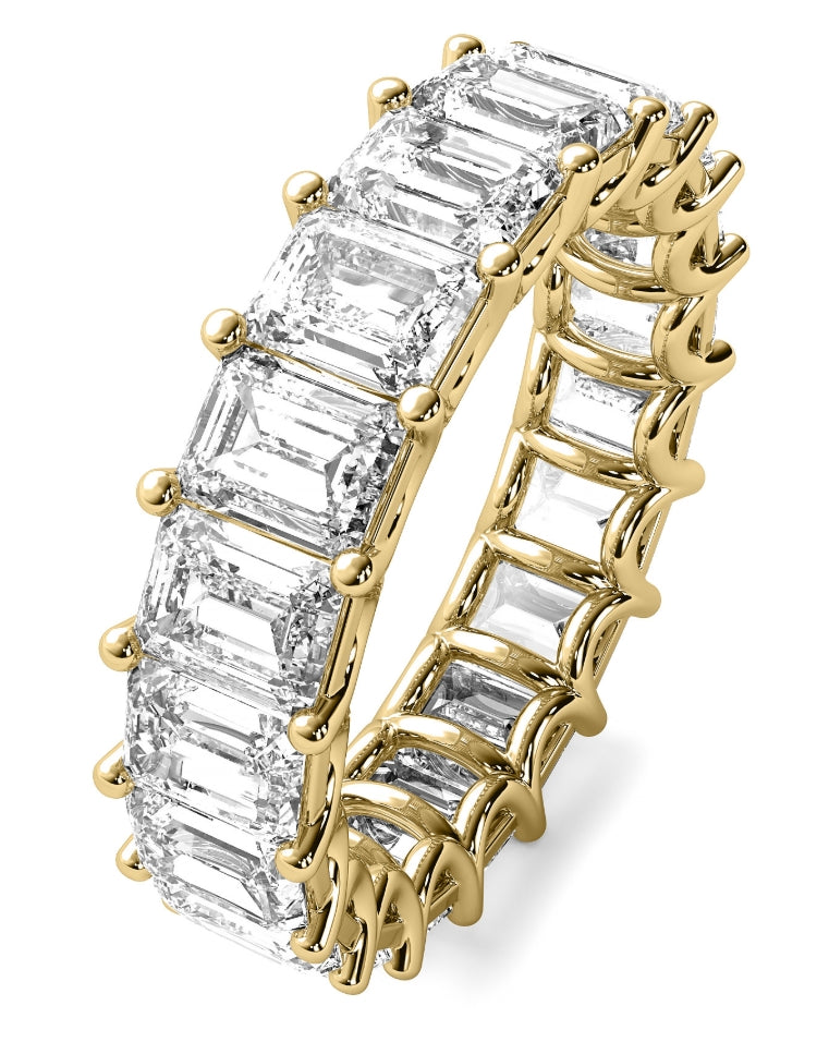 This elegant eternity band features Emerald diamonds totaling 2.8 to 3.4 carats, all prong-set in classic 14K or 18K gold. With a smooth, comfortable fit and timeless design, it’s perfect for pairing with your engagement ring, wearing on its own, or stacking.