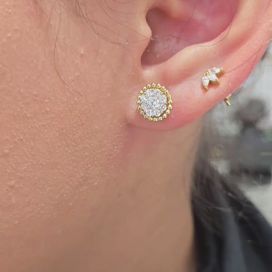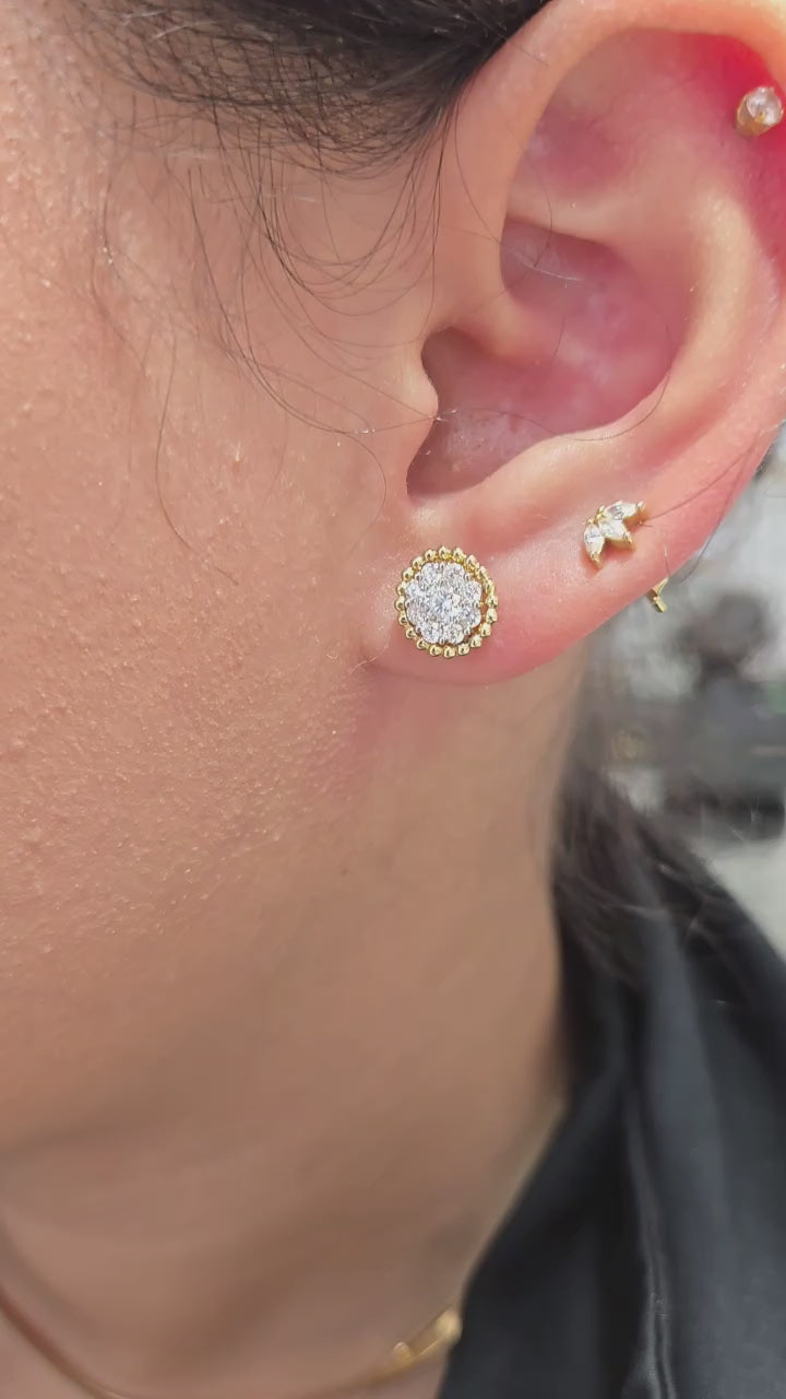 Beautifully Designed Diamond Flower Clustered earrings with Bead design around. Push Back Studs Made of Solid 14k Yellow Gold. Approx 0.64cts of Natural Si-g/h Diamonds.