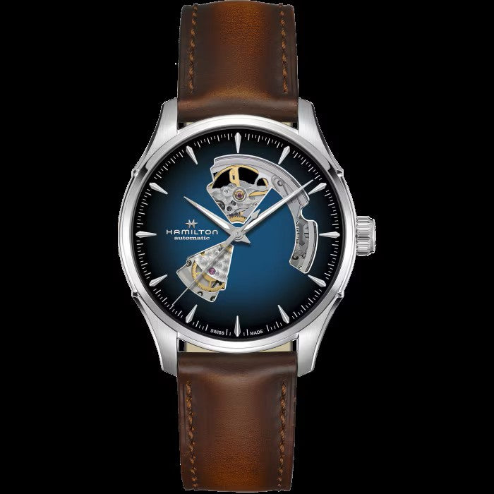 Offering a glimpse of its powerful inner mechanics, the Jazzmaster Open Heart lets precision take center stage with a new 42mm dial. Featuring a captivating midnight blue dial that sparkles, this showstopping timepiece fuses the modernity of urban architechture with the infinity of the cosmos. Showcasing Hamilton's ever-evolving craftsmanship and attention to detail, the dial brings the H-10 automatic movement into the spotlight. With its 80 hour power reserve and Nivachron™ balance spring, the Jazzmaster Open Heart Auto is fitted with an intricate stainless steel bracelet. Discover our collection of dress watches.
