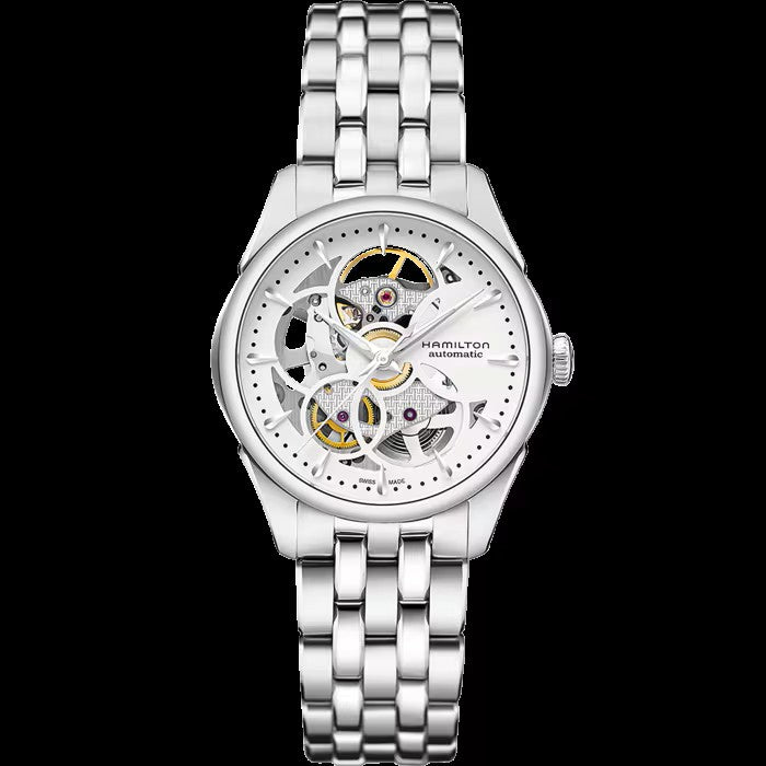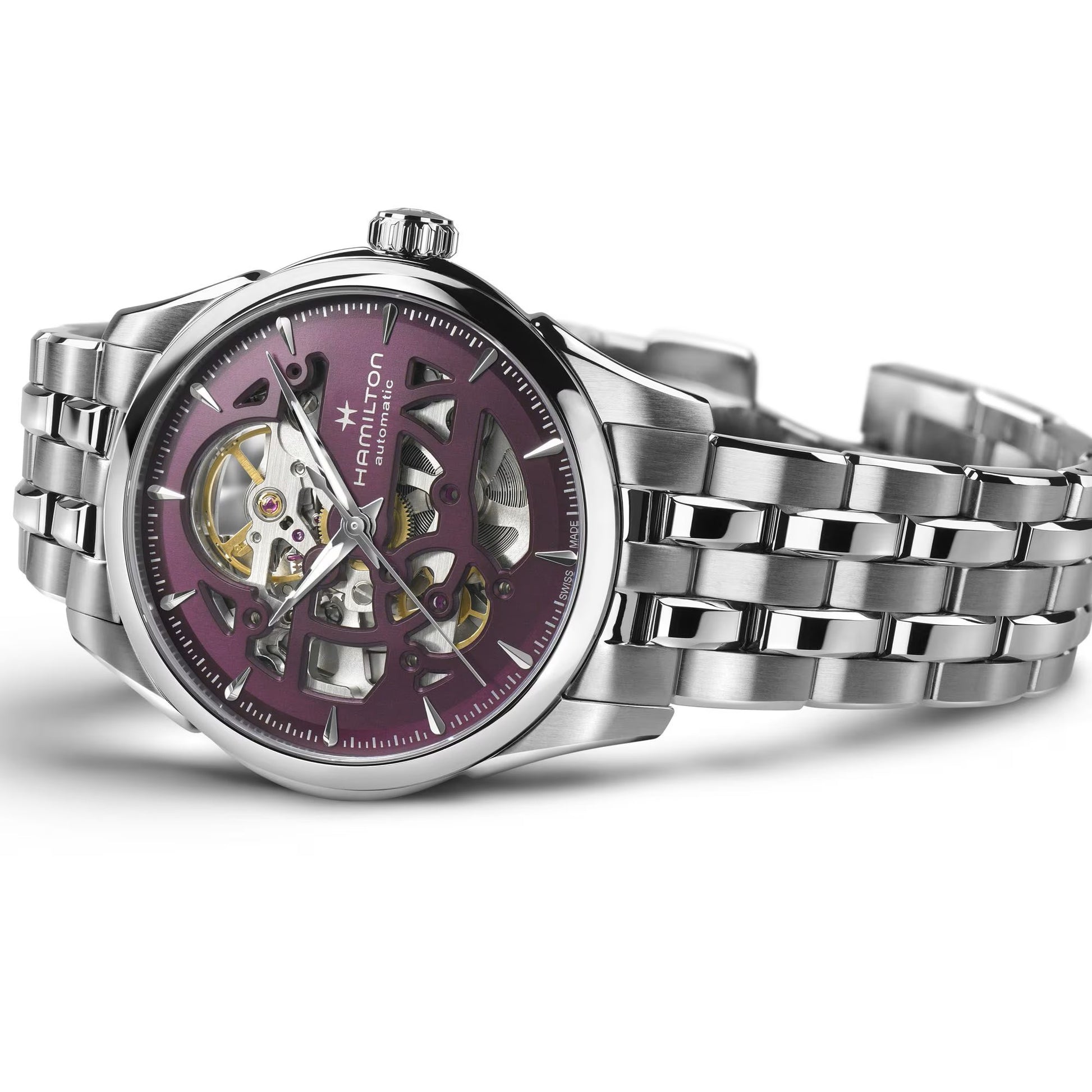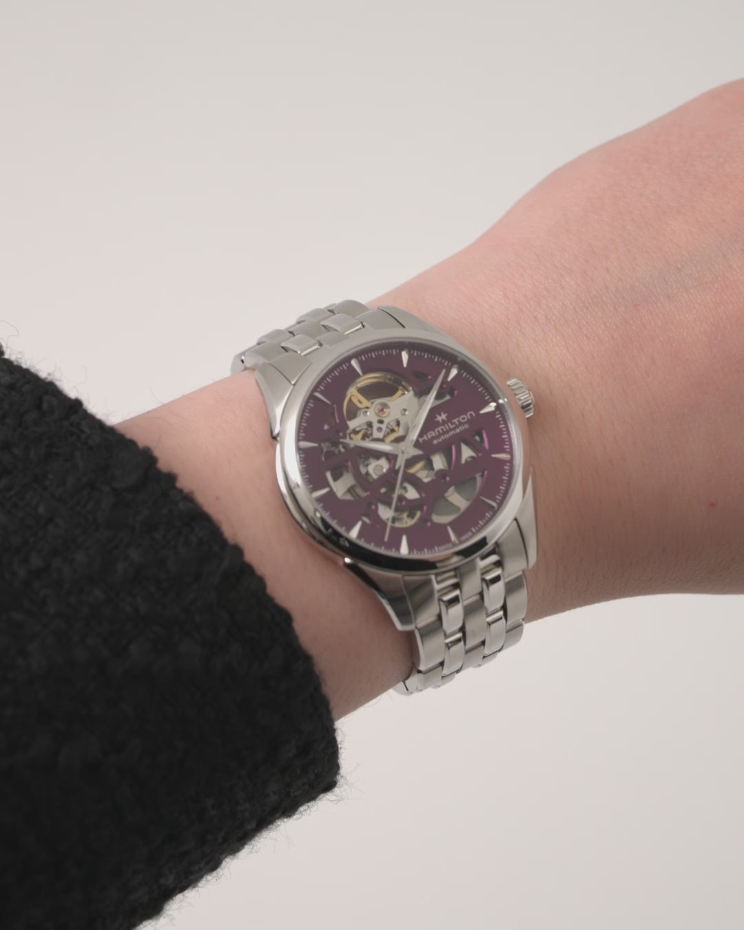 Let precision take centre stage with the 36mm Jazzmaster Skeleton and its purple cut-out dial, revealing the subtle beauty of this timepiece's inner mechanics. Bringing the H-10-S automatic movement into the spotlight, with an 80 hour power reserve and Nivachron™ balance spring, the Jazzmaster Skeleton is fitted with an intricate stainless steel bracelet, showcasing Hamilton's ever-evolving craftsmanship and attention to detail.