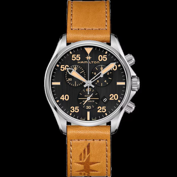 Created specifically with pilots in mind, this sporty quartz chronograph with 44 mm stainless steel case is a perfect mix of aviation style and Swiss-made precision. With sand colored Super-LumiNova® numerals, indexes and hands against a sleek black dial, it’s a watch made for the cockpit that also looks good on the ground.