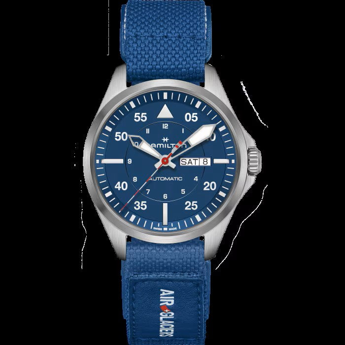 Dedicated to a unique partnership with the courageous Air-Glaciers, this special edition Khaki Aviation Pilot marks a collaboration like no other. Featuring a blue dial and a hypoallergenic, lightweight titanium 42mm case, it's a timepiece that's both durable and easily wearable. Pairing our signature H-30 automatic movement, 80-hour power reserve and a nylon outer, leather lined Velcro strap for maximum customization, this is a timepiece that's always ready for action.