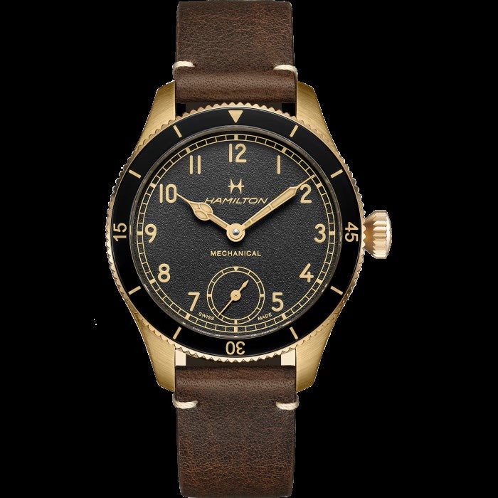 inspired by the Model 23, a cutting-edge pocket watch used by U.S. soldiers during WWII, the Khaki Pilot Pioneer's distinctive design is a tribute to Hamilton's aviation and military heritage. The sporty yet refined pilot watch retains an indisputably technical feel with its handwinding mechanical movement, bi-directional rotating bezel and prominent winding crown. Available with a sleek stainless steel or unique bronze case, this 43mm timepiece is ready to fly.