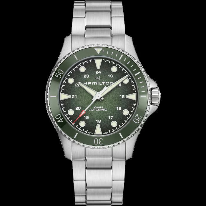 The 43mm Khaki Navy Scuba Automatic pairs a deep green ceramic bezel with a matching gradient dial, exposing a palette of shades from dark to forest green. Powered by our H-10 automatic movement, this timepiece is a perfect choice for those who appreciate form and function at once. Appealing and ubiquitous, the green colorway adds an edge to the Khaki Navy Scuba, making it a timeless companion for any challenge, from aquatic explorations to urban adventures.