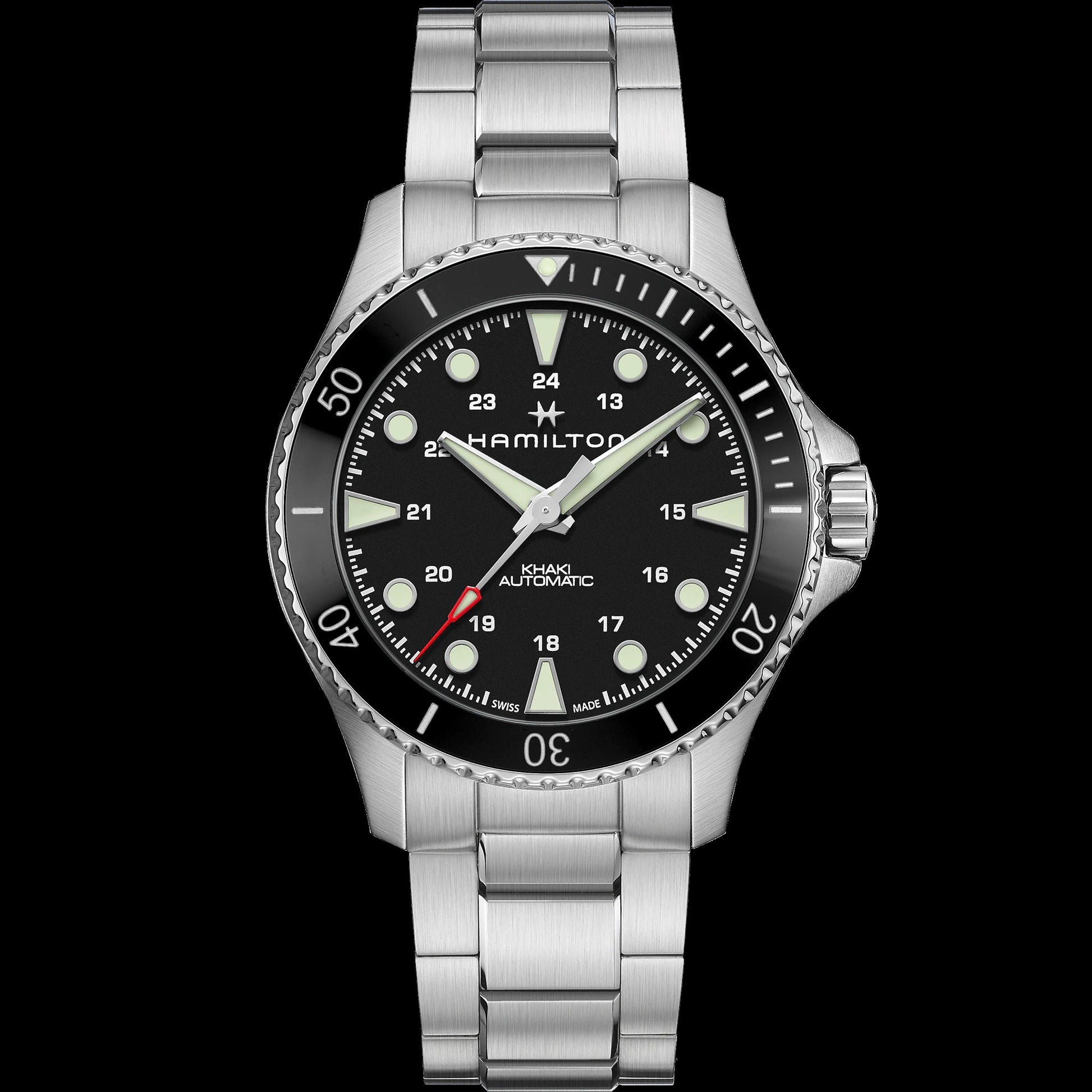 The 43mm Khaki Navy Scuba Automatic pairs a deep green ceramic bezel with a matching gradient dial, exposing a palette of shades from dark to forest green. Powered by our H-10 automatic movement, this timepiece is a perfect choice for those who appreciate form and function at once. Appealing and ubiquitous, the green colorway adds an edge to the Khaki Navy Scuba, making it a timeless companion for any challenge, from aquatic explorations to urban adventures.