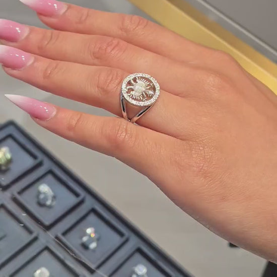 This exquisite ring features a beautifully crafted Albanian eagle, symbolizing freedom and strength, intricately set with top Quality diamonds that enhance its allure.