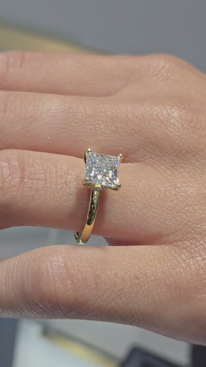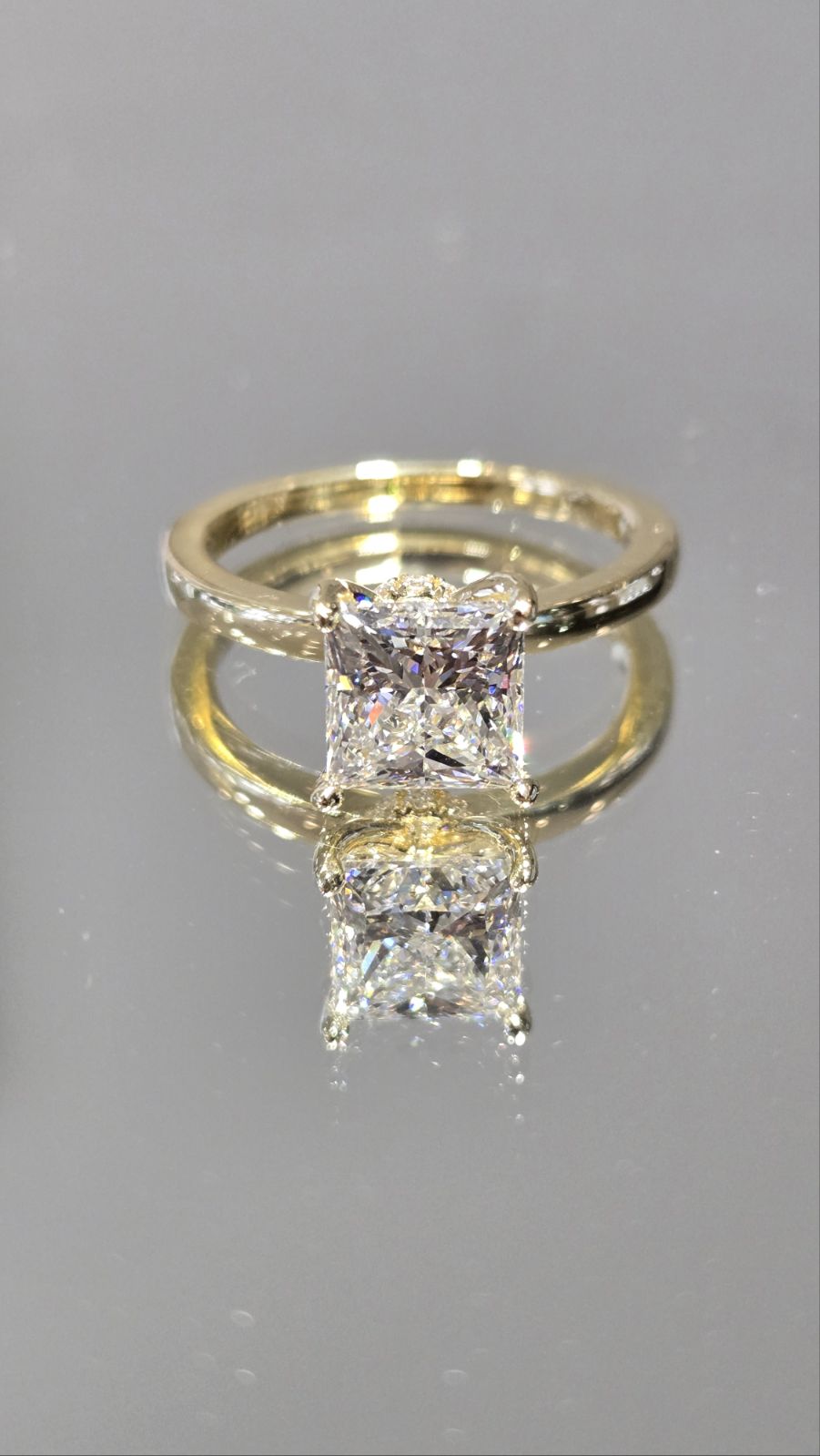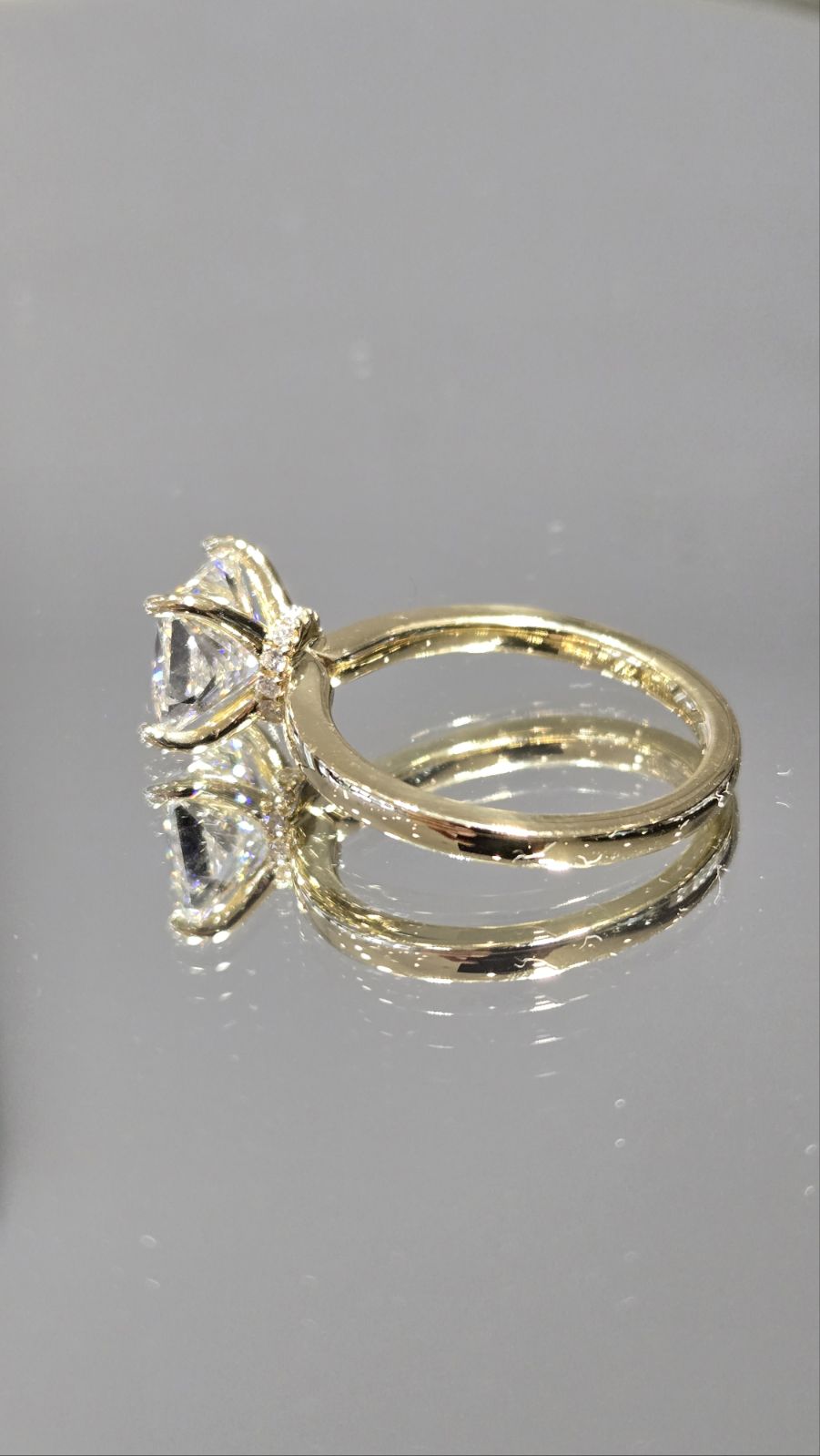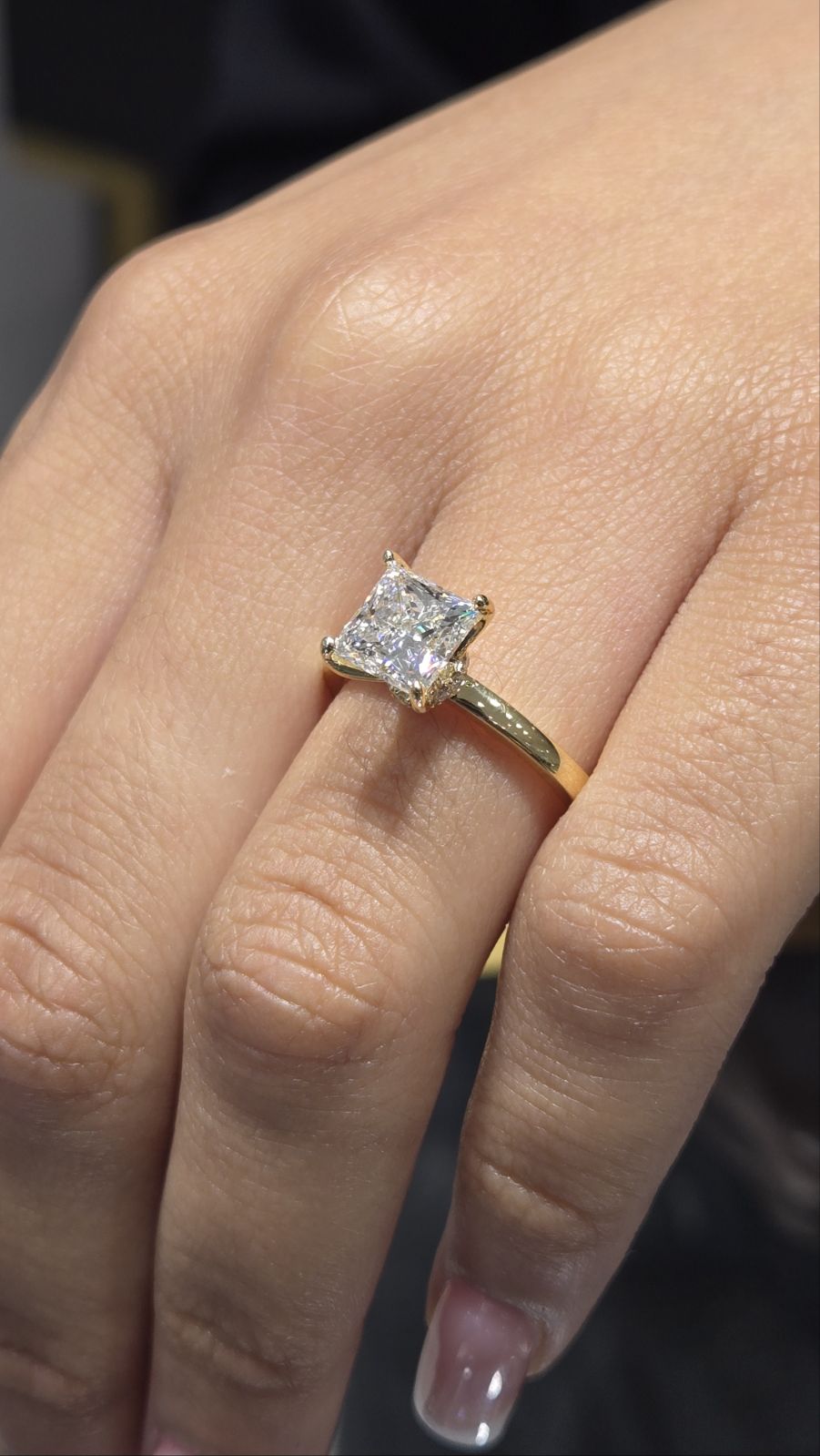 Model is wearing an 18k Yellow Gold Ring with a 2ct Lab Diamond Center Size 6.