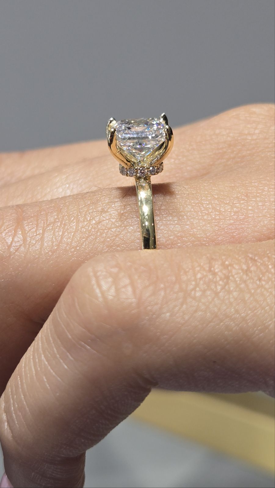This Stunning Princess Cut Center Diamond set in a 4 Prong Solitaire with a rounded hidden halo.