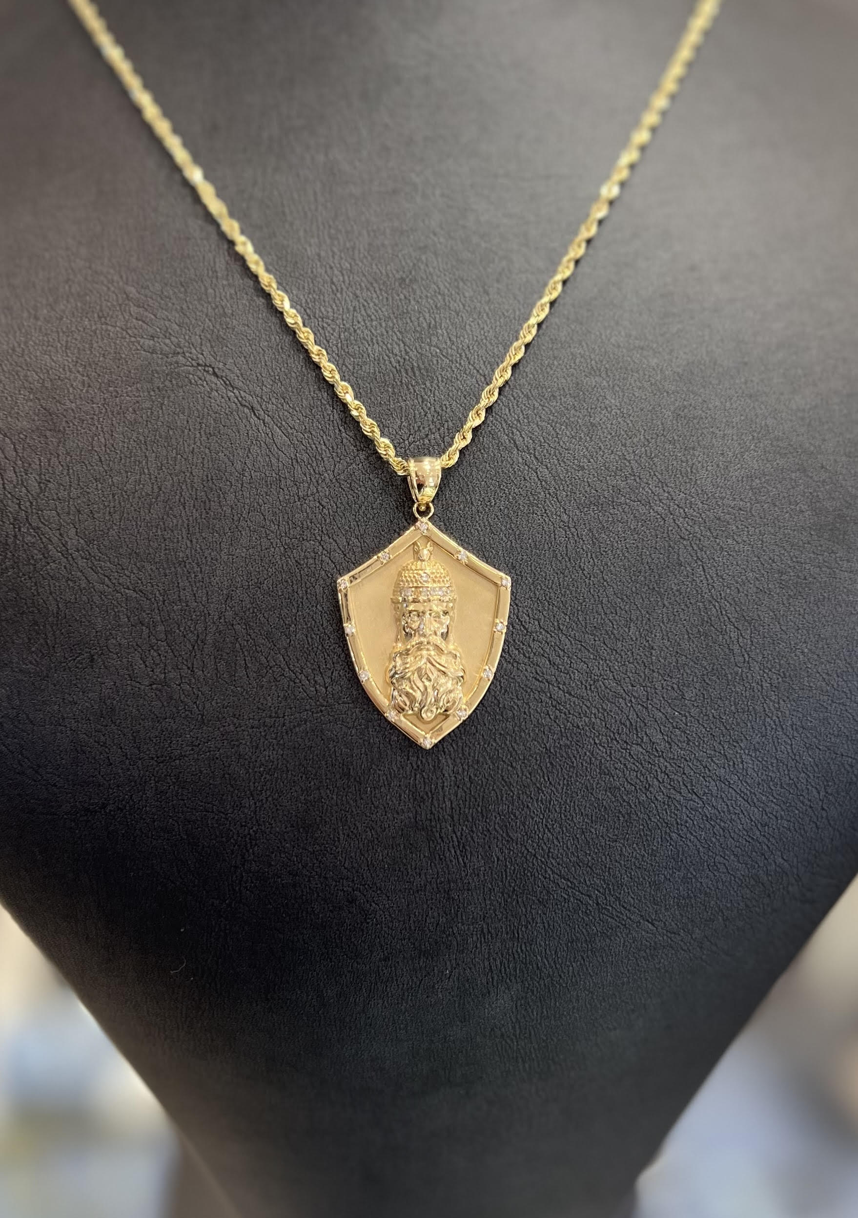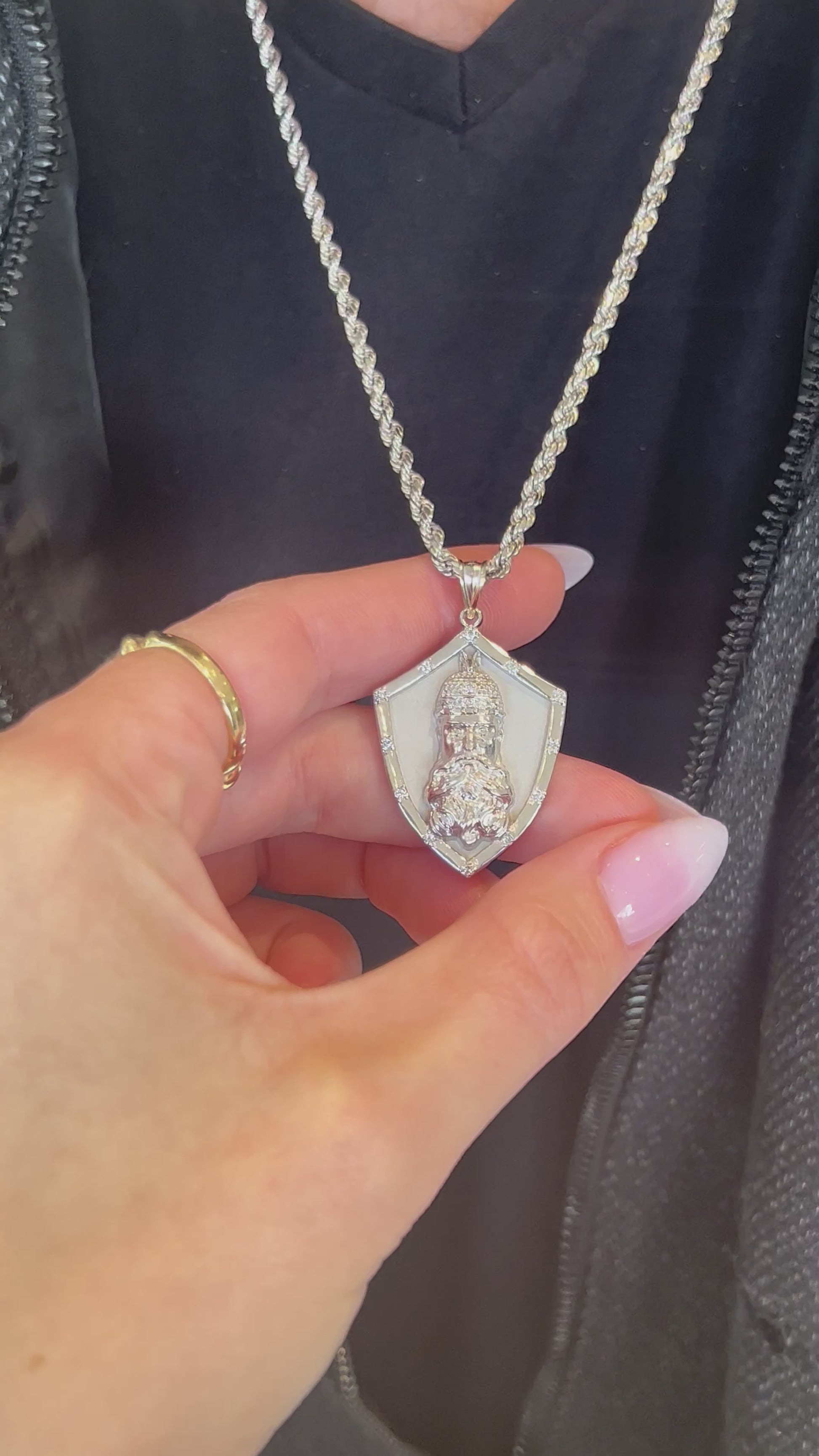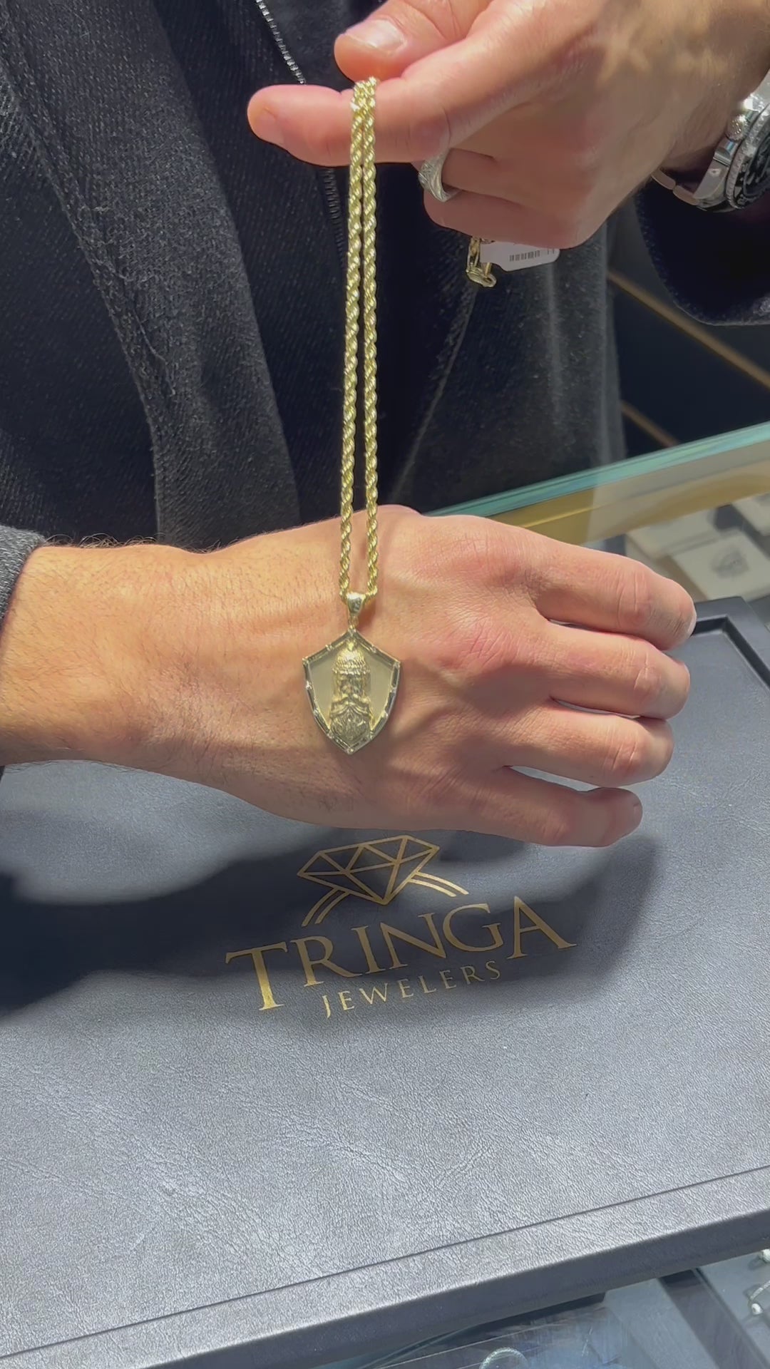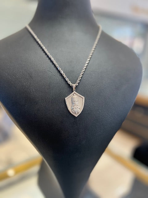 Exclusively Designed & Custom Made by Tringa Jewelers. This Skanderbeg Shield Pendant will turn heads with its Solid Detailed Look, Crafted from Solid Gold or Silver. Natural VS Diamonds are Set around the shield and his helmet.