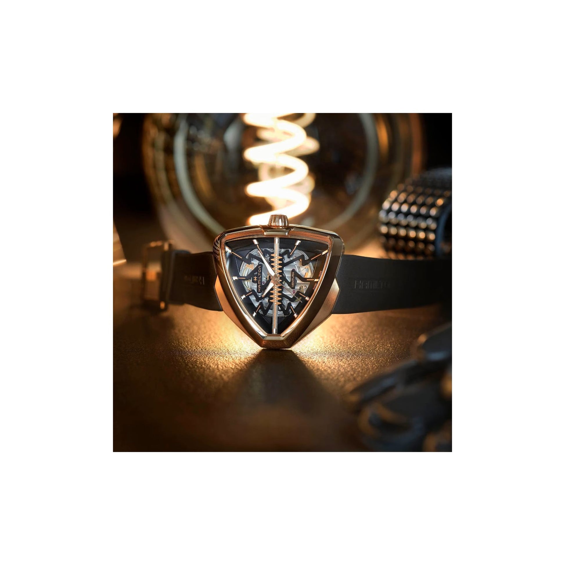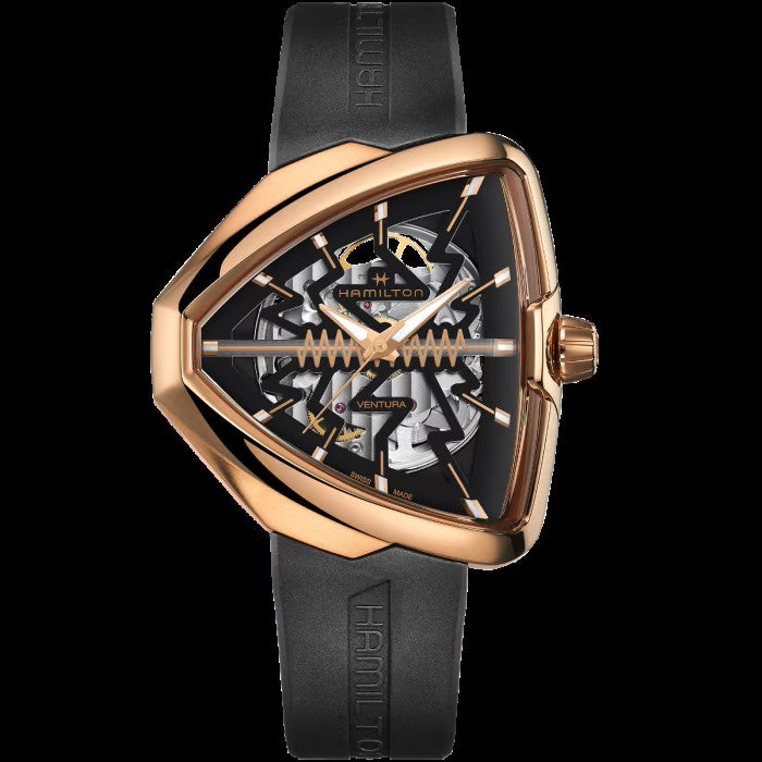 Dare to be bold with the Ventura Elvis80 Skeleton, an ultra-modern tribute to the past, present and future of the world’s first electric watch. A powerful evolution of a revolutionary timepiece, its precise skeletonized dial features a striking zigzag at the center to match its luminous rose gold PVD-coated, triangular case. This bolt of energy celebrates an iconic symbol of innovation and draws the eye to the automatic H-10-S movement underneath.