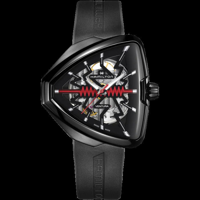 Dare to be bold with the Ventura Elvis80 Skeleton, an ultra-modern tribute to the past, present and future of the world’s first electric watch. A powerful evolution of a revolutionary timepiece, its precise skeletonized dial features a striking zigzag at the center to match its luminous rose gold PVD-coated, triangular case. This bolt of energy celebrates an iconic symbol of innovation and draws the eye to the automatic H-10-S movement underneath.